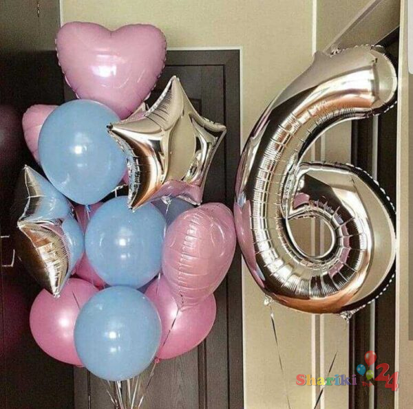 2) гелієві кульки, кулі з фольги у формі зірки та сердечки 18″ (45 см) — 4 шт ;
